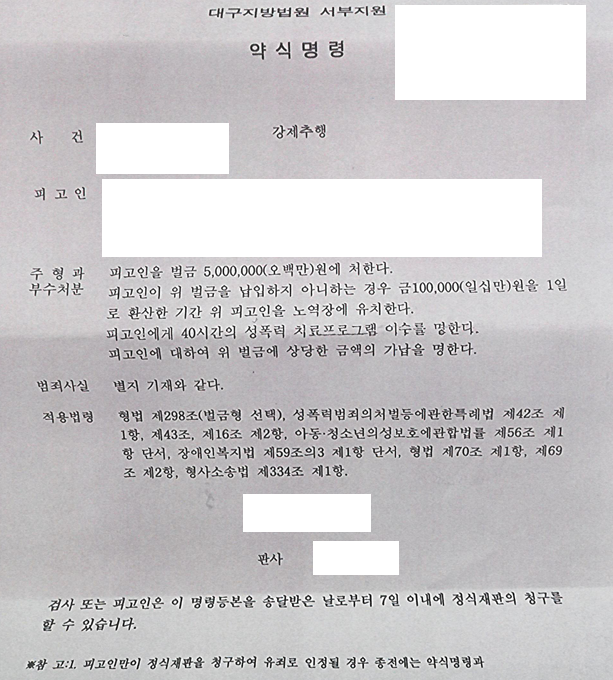 천마법무법인 조성윤 이창욱 변호사 사무실에서 변호한 결과, 다음과 같이 '약식명령'이 있었고, 의뢰인께서 정식재판 청구하지 않아 벌금형 확정되었습니다.