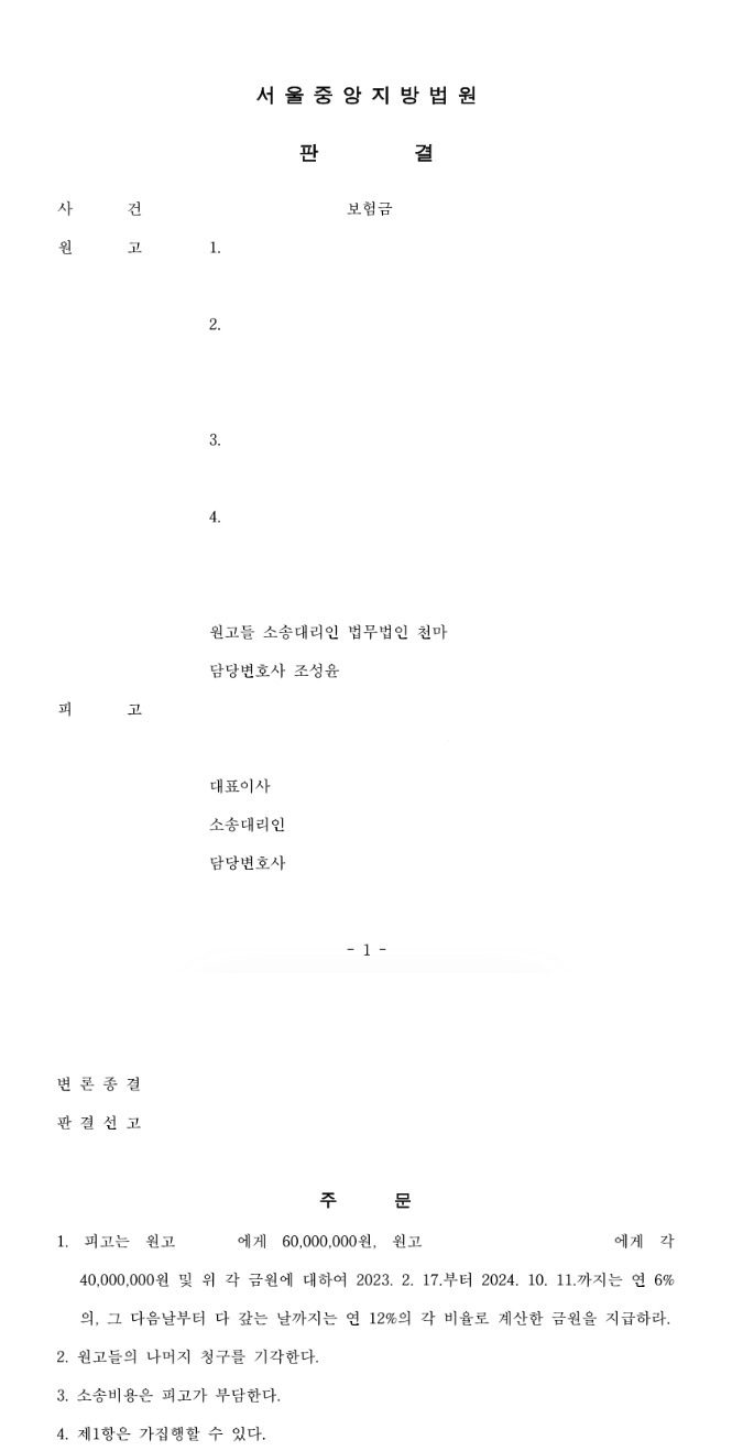 민사 사건 성공사례(보험금)(원고들 일부 승소)
