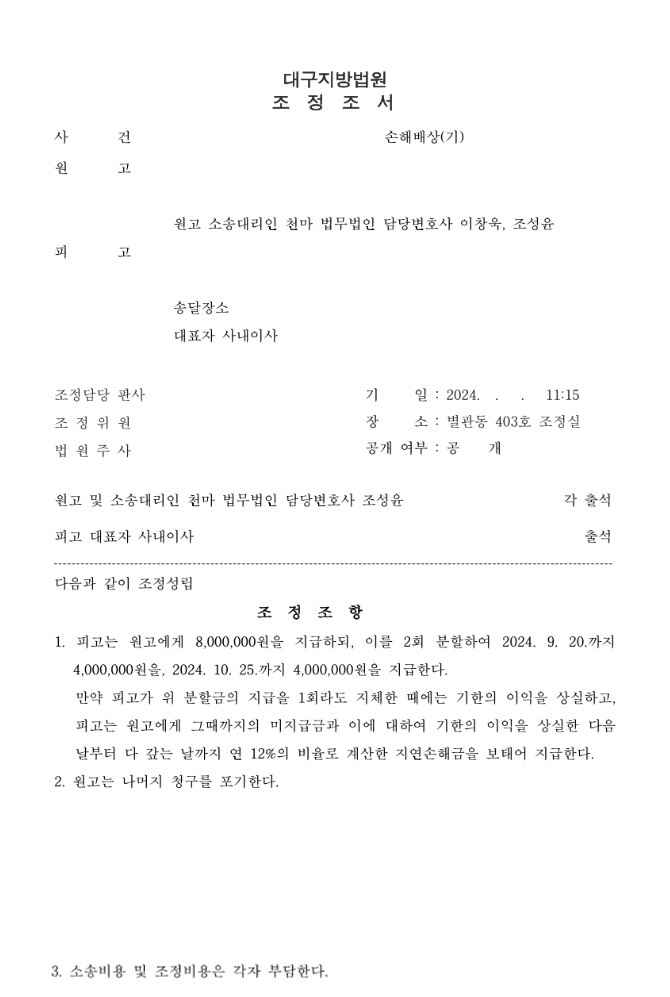 천마법무법인 조성윤 이창욱 변호사 사무실에서는 조정 절차에서 피고가 원고에게 돈을 지급하도록 조정을 성공적으로 진행하였습니다.