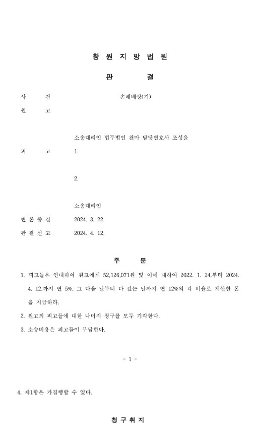 천마법무법인 조성윤 이창욱 변호사 사무실에서 변론한 결과, 원고의 청구를 일부 인용하는 취지의 판결을 선고 받았습니다(원고 일부 승소).