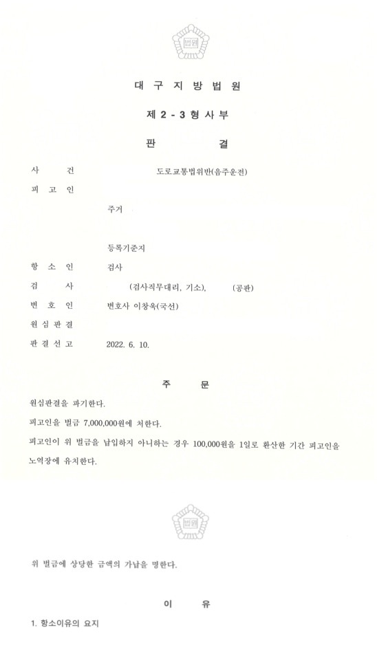 천마법무법인 조성윤 이창욱 변호사 사무실에서 변호한 결과, 2심에서는 의뢰인에 대하여 아래와 같이 감형된 판결을 선고하였습니다(벌금 1,000만 원 → 벌금 700만 원).