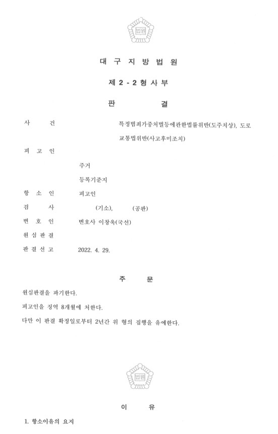천마법무법인 조성윤 이창욱 변호사 사무실에서 변호한 결과, 2심에서는 아래와 같이 감형된 판결을 선고하였습니다(징역 1년, 2년간의 집행유예, 40시간의 준법운전강의 수강명령 → 징역 8월, 2년간의 집행유예).