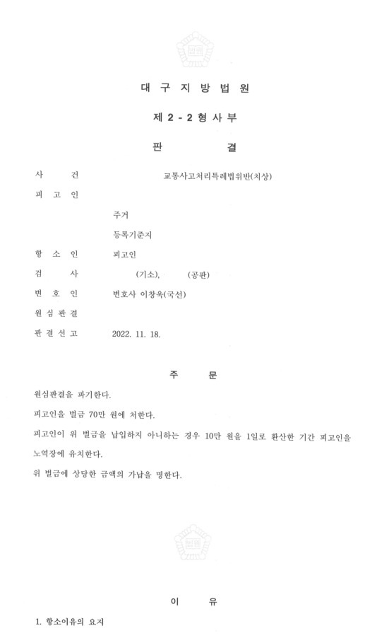 천마법무법인 조성윤 이창욱 변호사 사무실에서 변호한 결과, 2심에서는 아래와 같이 감형된 판결을 선고하였습니다(벌금 300만 원, 소송비용 부담 → 벌금 70만 원).