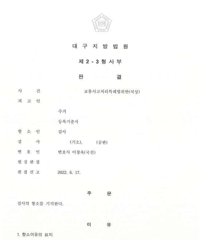 천마법무법인 조성윤 이창욱 변호사 사무실에서 변호한 결과, 2심에서는 아래와 같이 검사의 항소를 기각하는 판결을 선고하였습니다(검사 항소 기각).
