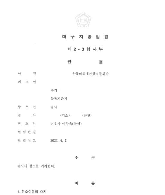 의료범죄 형사 사건 성공 사례(응급의료에관한법률위반)(검사 항소 기각)