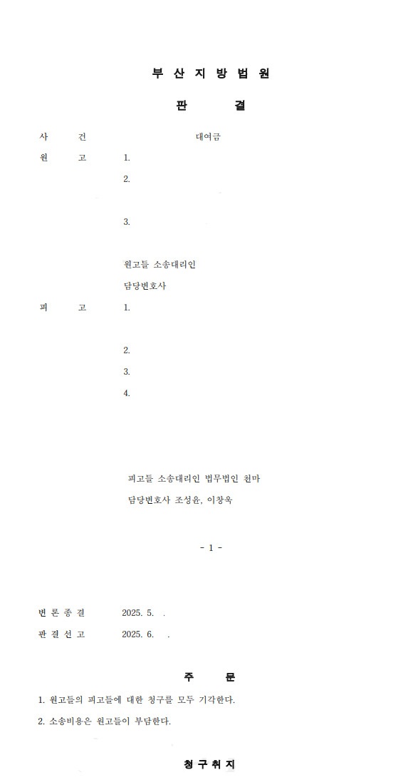 민사 사건 성공사례(대여금)(원고들 청구 기각, 전부 승소)