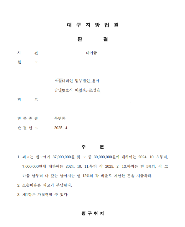 천마법무법인 조성윤 이창욱 변호사 사무실에서 변론한 결과, 원고의 청구를 전부 인용하는 취지의 판결을 선고 받았습니다(원고 전부 승소).