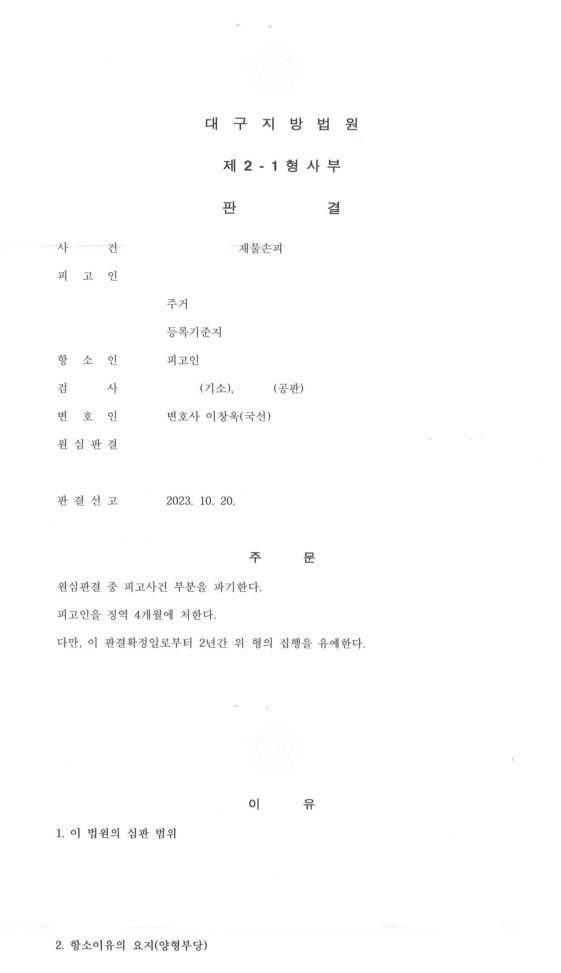재산범죄 형사 사건 성공사례(재물손괴)(실형 → 집행유예)