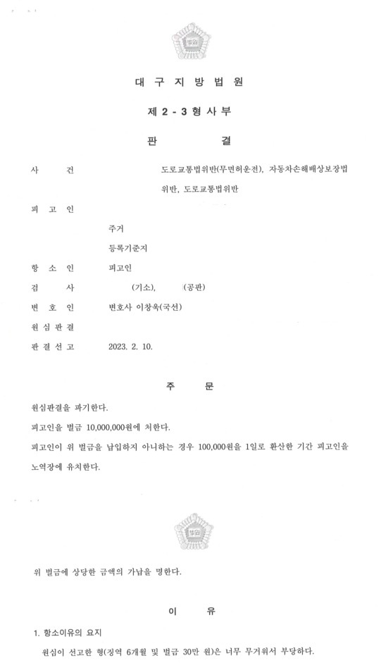 천마법무법인 조성윤 이창욱 변호사 사무실에서 변호한 결과, 2심에서는 의뢰인에 대하여 아래와 같이 감형된 판결을 선고하였습니다(징역 6월 및 벌금 300,000원 → 벌금 10,000,000원).