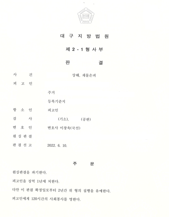 폭력범죄 형사 사건 성공사례(상해등)(실형 → 집행유예)