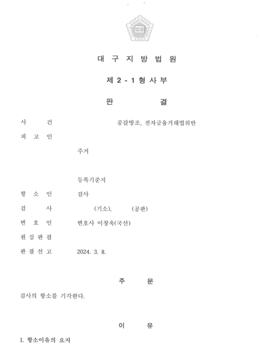 천마법무법인 조성윤 이창욱 변호사 사무실에서 변호한 결과, 2심에서는 의뢰인에 대하여 아래와 같이 검사의 항소를 기각하는 판결을 선고하였습니다(검사 항소 기각).