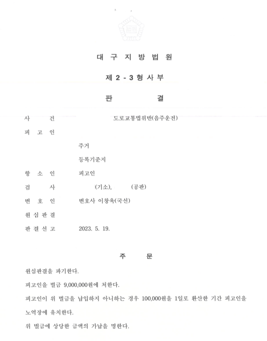 천마법무법인 조성윤 이창욱 변호사 사무실에서 변호한 결과, 2심에서는 의뢰인에 대하여 아래와 같이 감형된 판결을 선고하였습니다(집행유예 2년 → 벌금 9,000,000원).