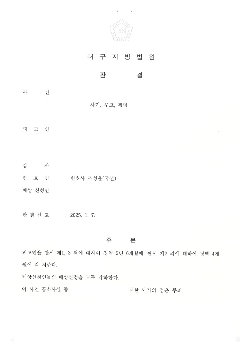 재산범죄 형사 사건 성공사례(사기등)(공소사실 중 일부 무죄)(실형 감형)