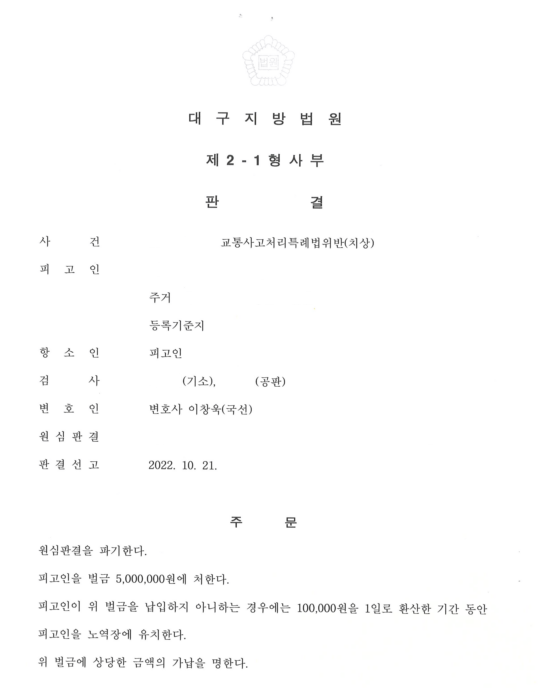 천마법무법인 조성윤 이창욱 변호사 사무실에서 변호한 결과, 2심에서는 의뢰인에 대하여 아래와 같이 감형된 판결을 선고하였습니다(금고 4월 → 벌금 5,000,000원).