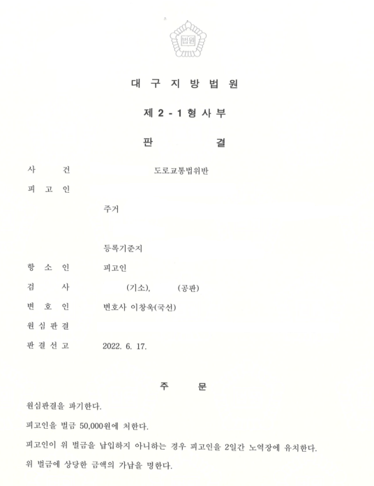 천마법무법인 조성윤 이창욱 변호사 사무실에서 변호한 결과, 2심에서는 의뢰인에 대하여 아래와 같이 감형된 판결을 선고하였습니다(벌금 20만 원 → 벌금 5만 원).