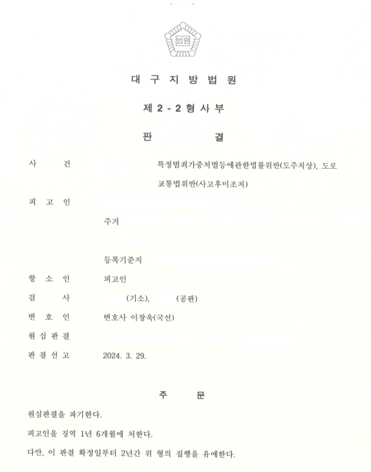 천마법무법인 조성윤 이창욱 변호사 사무실에서 변호한 결과, 2심에서는 의뢰인에 대하여 아래와 같이 감형된 판결을 선고하였습니다(징역 1년 6개월 → 집행유예 2년).