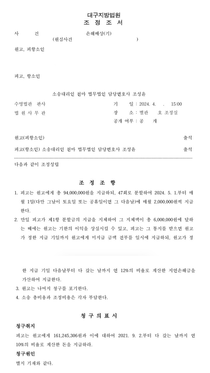 천마법무법인 조성윤 이창욱 변호사 사무실에서 변론한 결과, 의뢰인이 원고에게 1심에서 인용된 금액보다 훨씬 적은 돈을 지급하기로 하는 취지의 조정이 성립되었습니다(조정 성립).