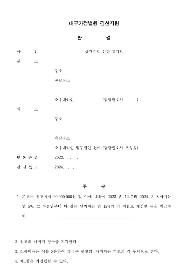 천마법무법인 조성윤 이창욱 변호사 사무실에서 변론한 결과, 원고가 청구하였던 위자료 3,100만 원 중에서 2,000만 원만 인용되는 취지의 판결을 선고 받았습니다(위자료 감액).