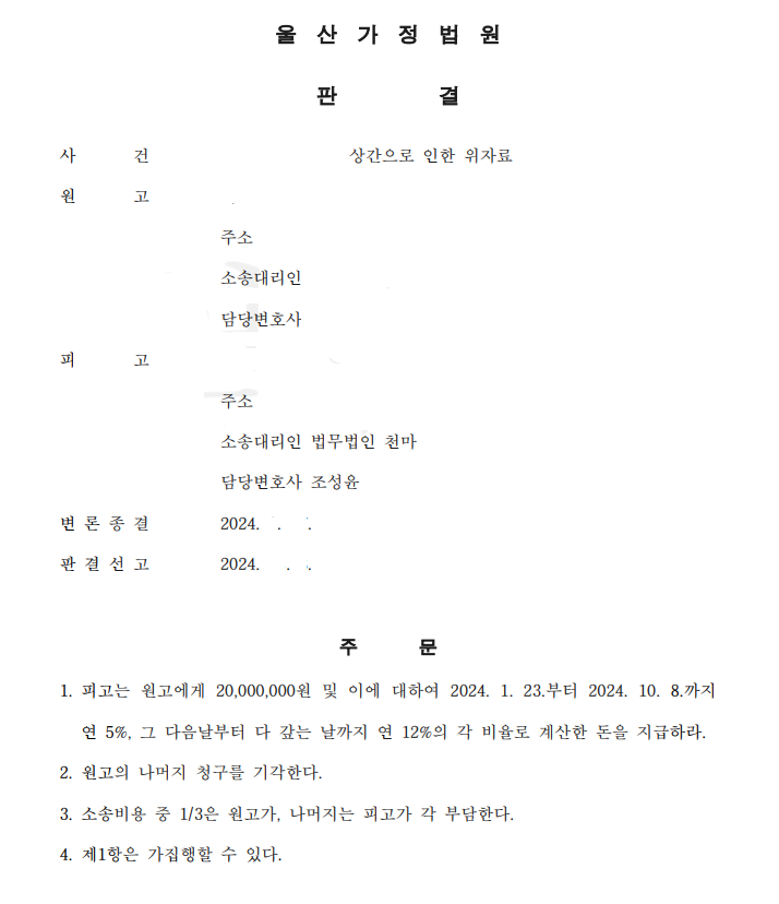 천마법무법인 조성윤 이창욱 변호사 사무실에서 변론한 결과, 원고가 청구하였던 위자료 3,000만 원 중에서 2,000만 원만 인용되는 취지의 판결을 선고 받았습니다(위자료 감액).