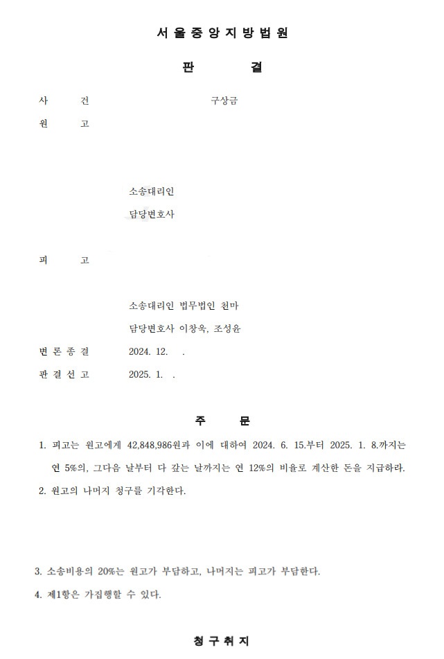 천마법무법인 조성윤 이창욱 변호사 사무실에서 변론한 결과, 원고의 청구 금액에서 약 1,500만원을 감액한 돈을 지급하라는 취지의 판결을 선고 받았습니다(원고 청구 일부 기각).