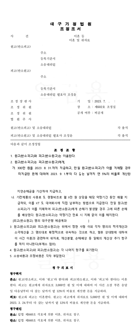 오늘은 천마법무법인에서 이혼 등 사건에서 어떻게 의뢰인에게 유리한 조정을 이끌어냈는지 알아보겠습니다.