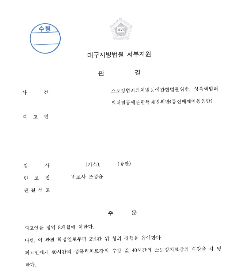 성범죄 형사 사건 성공사례(스토킹범죄의처벌등에관한법률위반등)(집행유예)
